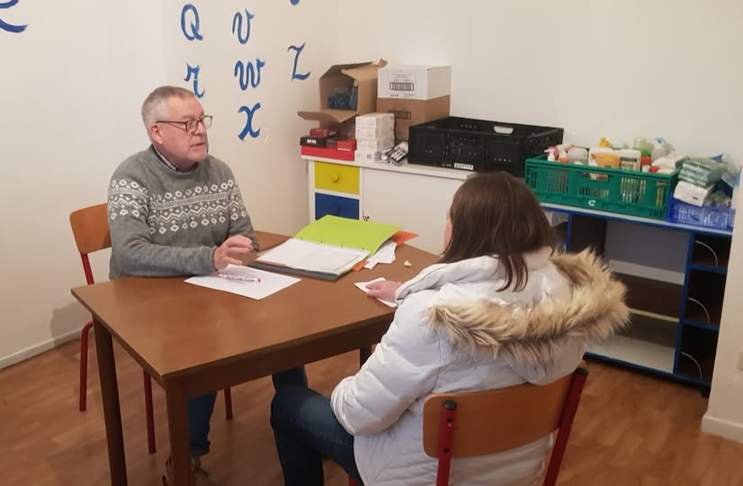 Une salle a été aménagée en bureau au centre Restos, pour recevoir en toute tranquillité. Ici, une personne accueillie, qui compte sur les Restos pour repartir vers l’emploi… Les centres Restos du Coeur sont aussi un tremplin vers un nouveau départ professionnel, grâce à l’orientation par les bénévoles…